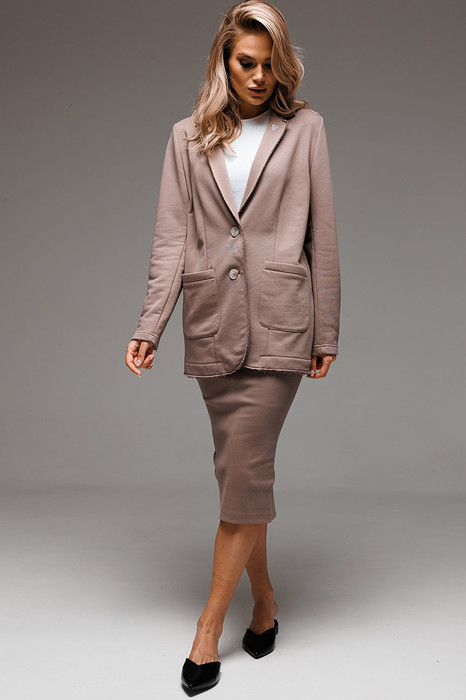 Костюм Gowear из футера в стиле smart casual поможет создать в меру строгий и одновременно расслабленный образ. Костюм состоит из жакета и юбки из эластичной ткани кошкорсе. Жакет прямого силуэта с воротником и лацканами, имеет удобные карманы и застежку на 2 пуговицы. На левом лацкане вышивка-логотип в контрастном цвете. Низ и борта имеют открытые края (эффект необработанного шва), укреплены дополнительной строчкой. Жакет без подкладки. Юбка прямая, облегающая фигуру с разрезом на спинке. Пояс цельнокроенный с резинкой внутри.