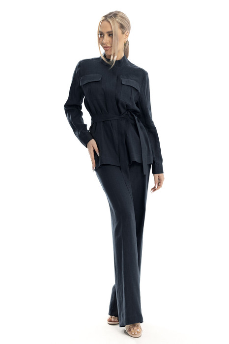 Жакет с центральной потайной застежкой на петли и пуговицу, втачным воротником-стойкой. По переду с накладными карманами с клапаном. Плечевой шов переходит на перед. Спинка с кокеткой, бантовой складкой по шву притачивания кокетки. Жакет со съемным поясом. Брюки без пояса, верхний срез обработан обтачками. Застежка -гульфик и на одну петлю и пуговицу по верхнему краю брюк. Передние половинки с карманами. Вход в карман наклонный к боковому шву.