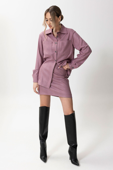 Блузон с центральной застежкой на петли и пуговицы, втачным воротником с отрезной стойкой. На уровне линии груди расположены накладные карманы. Спинка цельная. Низ фигурный. Рукав втачной, длинный, с отреной манжетой, застегивающейся на одну петлю и пуговицу. Юбка короткая, без пояса, верхний срез обработан обтачкой. Застежка на потайную молнию в среднем шве заднего полотнища.