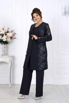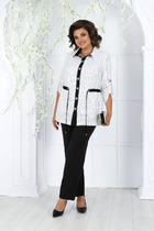 Блузон с центральной застежкой на петли и пуговицы, втачным воротником с отрезной стойкой. По переду с нагрудными вытачками, спинка цельная, по боковым швам- разрезы. Рукав втачной, длинный, с отрезной манжетой. Топ без воротника, с V-образным вырезом горловины. По переду с нагрудными вытачками. Брюки прямые, с отрезным поясом. Пояс присборен на резинку. Передние половинки с карманами. Вход в карман наклонный к боковому шву.