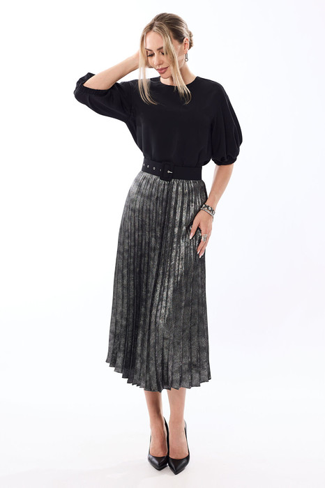 Блузка, без воротника, с круглым вырезом горловины, застежкой на потайную молнию в среднем шве спинки. По переду с нагрудными вытачками. По спинке со средним швом. Рукава с отрезной манжетой, присборенной на резинку. Плечо спущенное. Юбка, с отрезным поясом, застежкой на потайную молнию в левом боковом шве. Юбка плиссированная со складками гофре. Комплект со съемным поясом.