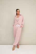Жакет с центральной застежкой на петли и пуговицы, без воротника, с V-образным вырезом горловины. По переду с талиевыми вытачками и рельефами, выходящими из проймы, прорезными карманами в рамку, расположенными на уровне линии талии. Спинка со средним швом, рельефами, выходящими из проймы. Рукав втачной, короткий. Брюки с отрезным поясом, на поясе по переду расположены декоративные пояски с пряжками. Пояс в области спинки присборен на резинку. Застежка гульфик. По боковым швам расположены карманы. Вход в карман наклонный к боковому шву.