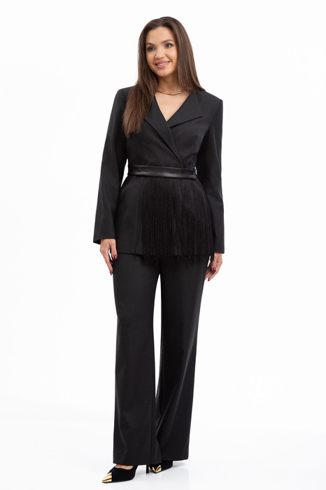 Жакет с центральной двубортной застежкой на пришивные кнопки, без воротника с отложными лацканами. По переду с рельефами, выходящими из проймы, талиевыми вытачками. Спинка со средним швом, рельефами, выходящими из проймы, талиевыми вытачками. Рукав втачной, длинный. Брюки с отрезным поясом, на поясе расположены шлевки. В боковых швах расположены карманы. Вход в карман наклонный к боковому шву. Застежка гульфик. Пояс в области спинки присборен на резинку. Костюм со съемным декоративным поясом. Декоративный пояс из кожзама, декорирован бахромой.