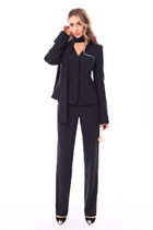 Жакет с центральной потайной застежкой на петли и пуговицы, без воротника, с V-образным вырезом горловины. По переду с рельефами, выходящими из проймы и входящими в боковой шов. По спинке с рельефами, выходящими из проймы. По низу спинки- баска. Рукав втачной, длинный. Брюки-с отрезым поясом, на поясе расположены шлевки. В области спинки пояс присборен на резинку. Застежка гульфик. Передние половинки с карманами. Вход в карман наклонный к боковому шву.
