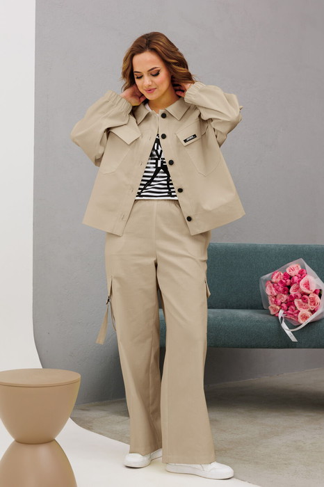 Жакет свободного силуэта, воротник рубашечного типа, рукав спущенный длинный на резинке по низу. По переду кокетка и накладные карманы с клапаном. Застежка по переду на петли и пуговицы.