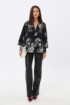 Костюм женский с брюками, футболкой и удлиненной рубашкой из шифона. Рубашка прямого силуэта со втачными рукавами и разрезами по бокам, застежка-планка на петли и пуговицы. Базовая трикотажная футболка полуприлегающего силуэта с небольшими втачными рукавами и декоративной печатью. Футболка прошла тестовую стирку при температуре 30 градусов: печать не линяет и не тяет цвет. Брюки полуприлегающего силуэта заужены к низу, притачной пояс на резинке по бокам, застежка на молнию, петлю и пуговицу, в боковых швах карманы. Уход за изделиями из шифона: