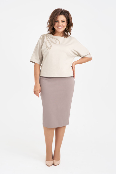 Женский костюм, состоящий из джемпера и юбки, выполнен из мягкого трикотажа, который держит форму. Джемпер свободного силуэта с цельнокроенными рукавами и застежкой-молнией по спинке. Джемпер дополнен дизайнерской вышивкой по переду и спинке. Классическая юбка-карандаш на трикотажной подкладке с завышенной линией талии, на обтачке, застегивается на молнию и имеет сзади шлицу.