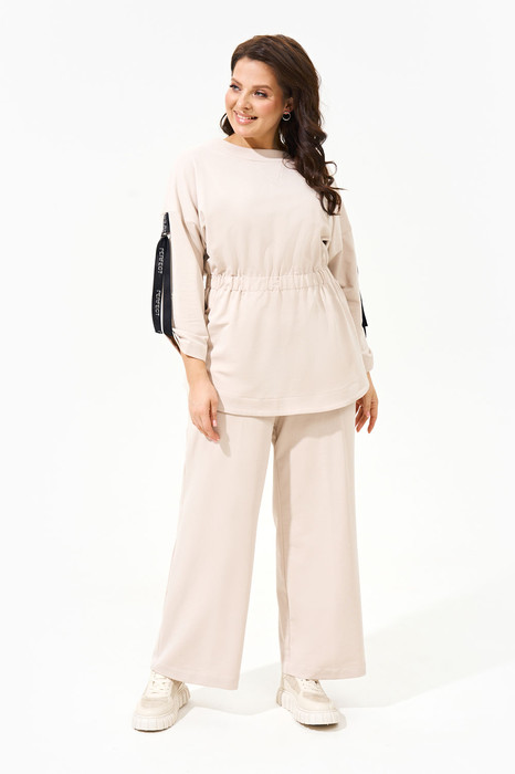 Костюм женский полуприлегающего силуэта выполнен из футера двухнитки класса пенье и состоит из джемпера и брюк. Джемпер с фактурной резинкой по линии талии; вырез горловины округлой формы; рукава со спущенной линией плеча и внутренней декоративной лентой (стильная деталь с изысканным акцентом), что позволяет регулировать высоту рукава; по спинке функциональная молния. Брюки свободного кроя прямые к низу на поясе-резинке с функциональными карманами в боковых швах.