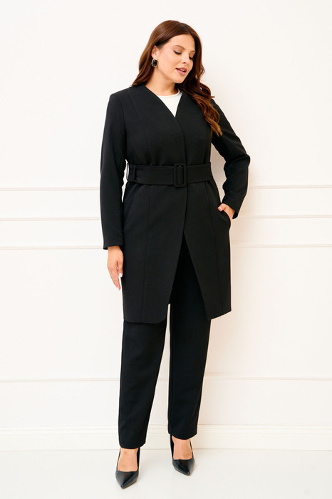 Костюм женский, состоящий из удлиненного жакета и брюк, выполнен из плотной костюмной ткани. Жакет на подкладке полуприлегающего силуэта до линии колена; рукава втачные; горловина V- образной формы; по переду рельефы и функциональные прорезные карманы; застежка на потайные пришивные кнопки. Зауженные к низу брюки полуприлегающего силуэта застегиваются на молнию, петлю и пуговицу; пояс притачной с резинками в боковых швах для лучшего прилегания; на передних половинках функциональные карманы. В комплекте съемный пояс из основной ткани. Костюм полностью соответсвует заявленному размеру. Пользуйтесь таблицей замеров готового изделия.