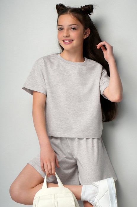 Серый костюм для девочки и девочки подростка создан, чтобы лето запомнилось абсолютным комфортом. Укороченная футболка и шортики клеш — идеальный тандем для активных и свободных от условностей подростков.