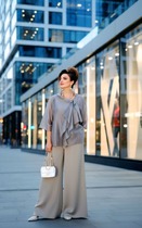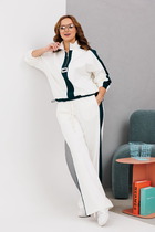 Комплект брючный 2-х предметный изготовлен из трикотажного полотна. Джемпер свободного силуэта, горловина обработана воротником – стойка. Низ переда с широкой планкой, декорированной печатью. Спинка цельнокроенная. В боковых швах обработаны карманы. Рукав спущенный, длинный. Брюки средней посадки, пояс на резинке дополнен шнуром. Брюки прямого покроя.