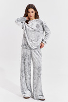 Костюм женский брючный 2-х предметный, состоит из блузы и брюк. Блуза свободного силуэта. На  левой полочке накладной карман. Рукав спущенный, по низу имитация манжеты. В боковых швах-разрезы. Горловина оформлена стояче-отложным воротником, застежка на петли и пуговицы. Брюки свободного кроя. Пояс на резинке, обработаны боковые карманы.