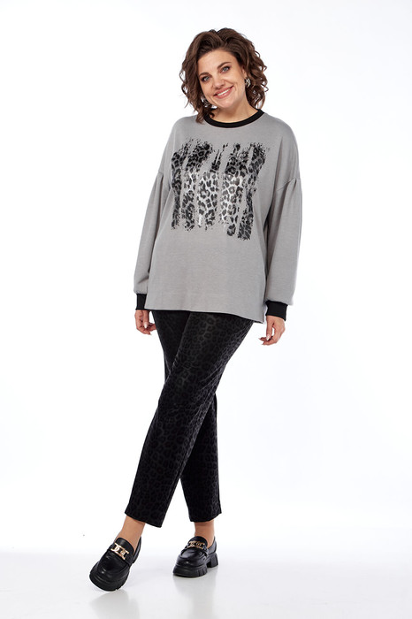 Комплект брючный 2-х предметный состоит из джемпера и брюк. Джемпер свободного силуэта выполнен из трикотажного полотна. Горловина  округлой формы обработана бейкой из отделочной ткани. Перед и спинка цельнокроенные. Рукава спущенные со складками по верхнему срезу, на манжете. По боковым швам небольшие разрезы. Джемпер дополнен дизайнерской печатью. Брюки средней посадки, выполнены из полотна с имитацией кожи с рисунком “леопард”. В передних деталях обработаны карманы. Пояс притачной на эластичной тесьме.