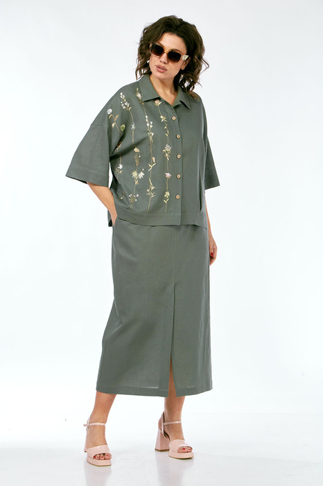Костюм женский 2х-предметный, состоит из блузки и юбки, выполнен из натуральной ткани белорусского производства. Блузка свободного силуэта с воротником рубашечного типа и центральной застежкой на петли с пуговицами. Низ переда обработан притачной планкой. На спинке кокетка и складки. Рукава спущенные с отложными манжетами. Блузка декорирована вышивкой. Юбка прямого силуэта с притачным поясом, частично на эластичной тесьме. По переду обработаны боковые карманы, в центральном шве переда имеется шлица. Юбка на подкладке.