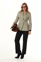 Комплект женский брючный, состоит из джемпера и брюк. Джемпер свободного кроя, изготовлен из трикотажного полотна. Горловина V-образной формы. На полочке-вышивка. Спинка цельнокроенная. Рукава спущенные, с манжетами по низу. В боковых швах-разрезы. Брюки классические из костюмной ткани. В брюках обработан пояс, частично на резинке. Застежка на молнию, петлю и пуговицу. В брюках обработаны боковые карманы. Сзади обработана кокетка.