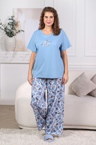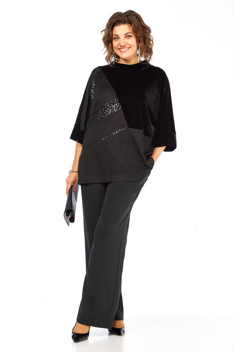 Комплект брючный, нарядный, состоит из джемпера и брюк. Джемпер женский, свободного кроя. Выполнен путем комбинирования трикотажного полотна и бархата, с декоративными вставками из пайеток по переду. Горловина обработана воротником стойкой. Рукава цельнокроеные с притачными манжетами. Брюки прямого силуэта из костюмно-плательной ткани. Пояс притачной на резинке. В брюках обработаны карманы.
