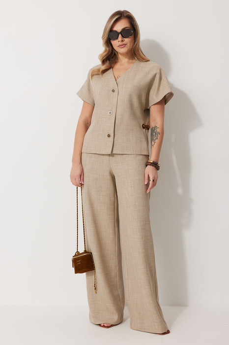 Костюм женский, состоящий из жилета и брюк. Жилет прямого силуэта на подкладке со спущенной линией плеча длиной до линии бедра. Спинка с центральным швом. Горловина V-образной формы обработана подбортом с обтачкой. Застежка жилета центральная на  декоративные пуговицы. Брюки женские, прямого силуэта. По переду обработана застежка на молнию. Карманы наклонные с отрезным бочком. На задних половинках брюк застрочены вытачки. Верх обработан широким притачным поясом (частично на резинке), застегивающимся на петлю и пуговицу