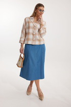 Юбка женская А – силуэта длиной до середины икры. Перед юбки состоит из 4 клиньев. Вверху передней части юбки располагается карман с отрезным бочком. Спинка юбки состоит из 4 клиньев. По среднему шву юбки находится застежка – молния.  Верхний срез юбки обработан обтачкой.