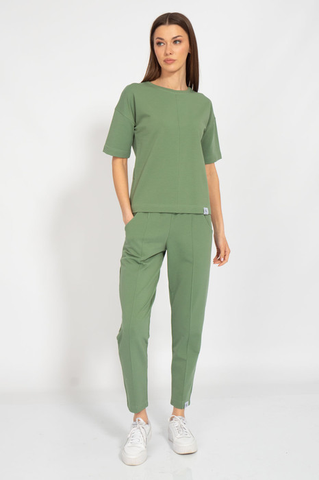 Костюм с брюками средней посадки с отделкой в виде канта по деталям переда и карманами в боковых швах и классическим джемпером с отделкой по переду. Ткань 2-х ниточный футер с изнанкой из хлопка, качество Пенье, плотность 235 г.м2