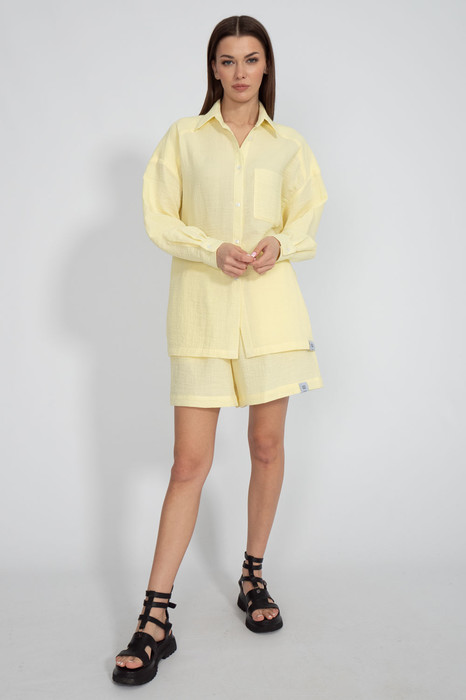Костюм состоящий из рубашки и шорт. Нежная натуральная хлопковая ткань - муслин. Шорты свободного кроя с карманами в боковых швах. Рубашка свободного кроя со спущенными рукавами и накладным карманом. Ткань муслин.