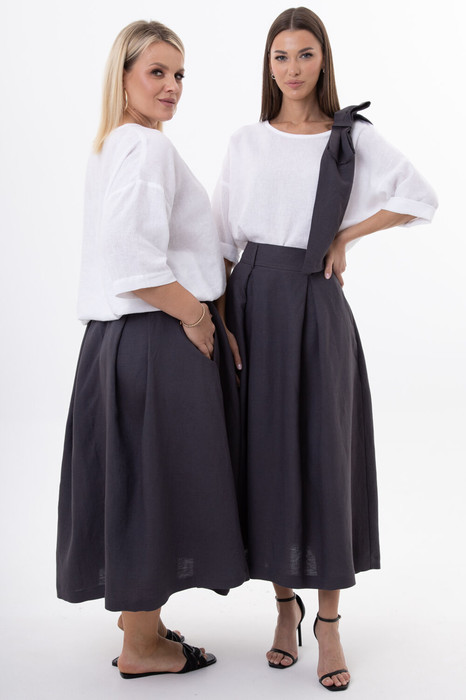 Элегантный костюм премиум-класса из белорусского льна с вискозой премиального качества — идеальный баланс романтики, практичности и экологичности. Набор включает джемпер свободного прямого кроя со съемным декоративным бантом и длинную юбку с эффектными встречными складками, боковыми карманами и потайной молнией. Натуральные материалы обеспечивают легкость, воздухопроницаемость и гипоаллергенность, сохраняя безупречный вид в любых ситуациях.