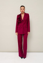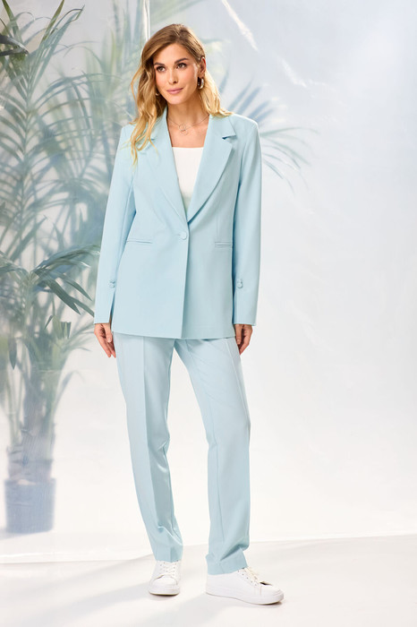 Комплект из костюмной ткани нежных, весенних  оттенков.Жакет женский, свободного силуэта,  на подкладке, длиной ниже линии бедер, с втачными рукавами, с центральной сквозной застежкой на 1петлю и 1 пуговицу до линии перегиба лацкана. Детали переда жакета с отрезными бочками, горизонтально расположенными боковыми прорезными карманами  с листочками, и талиевыми вытачками от разрезов карманов. Деталь спинки жакета с рельефными швами и со средним швом, который заканчивается шлицей. Рукава втачные двухшовные, с передним и локтевым швами,  внизу передних швов обработана шлица и декоративно прикреплены по 2 пуговицы над закрепкой. Воротник отложной пиджачного типа. Углы воротника и лацканов острые. Края воротника, лацкана, борта, клапанов обработаны в чистый край. Жакет с притачной понизу подкладкой.