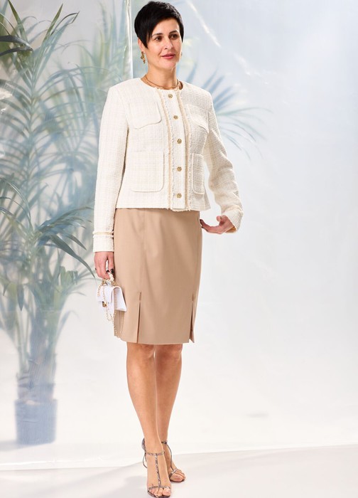 Жакет женский, полуприлегающего силуэта,из буклированной трикотажной ткани молочного цвета на подкладке, длиной до линии бедер, с втачными рукавами, с центральной сквозной застежкой на 5 петель и 5 пуговиц. Детали переда жакета с нагрудными вытачками, с 2-мя накладными карманами с каждой стороны, по центру вертикально расположена декоративная тесьма. Деталь спинки жакета с плечевыми вытачками. Рукава втачные двухшовные, с передним и локтевым швами, по низу рукавов горизонтально расположена декоративная тесьма. Вырез горловины округлой формы «под горло». Жакет с притачной понизу подкладкой.