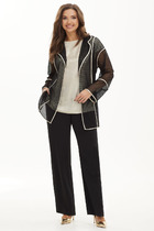 Стильный гармоничный комплект в стиле умеренного оверсайза, состоящий из свободного жакета и широких брюк. Эффектной деталью комплекта выступает высокая открытая шлица на спинке жакета, закрепленная пуговицами.