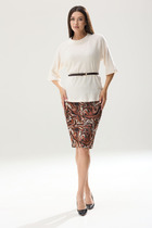 Комплект юбочный, состоящий из юбки и блузона из трикотажного полотна. Юбка прилегающего силуэта зауженная к низу, по среднему шву потайная застёжка-молния, в низу разрез. Верхний край юбка обработан обтачкой. Юбка на подкладке. Длина юбки по боковому шву 63 см. Блузон изготовлен из мягкого трикотажного полотна. Блузон прилегающего силуэта, слегка расклешён к низу, с нагрудными вытачками на полочке. Спинка со средним швом. В среднем шве спинки потайная застёжка- молния. Горловина обработана стойкой-воронкой, высотой 3,5 см. Рукав - реглан, слегка расклешён к низу. В комплекте идёт ремень.