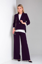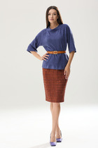 Комплект юбочный, состоящий из юбки и блузона из трикотажного полотна. Юбка прилегающего силуэта зауженная к низу, по среднему шву потайная застёжка-молния, в низу разрез. Верхний край юбка обработан обтачкой. Юбка на подкладке. Длина юбки по боковому шву 63 см. Блузон изготовлен из мягкого трикотажного полотна. Блузон прилегающего силуэта, слегка расклешён к низу, с нагрудными вытачками на полочке. Спинка со средним швом. В среднем шве спинки потайная застёжка- молния. Горловина обработана стойкой-воронкой, высотой 3,5 см. Рукав - реглан, слегка расклешён к низу. В комплекте идёт ремень.