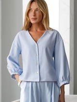 Блуза (рубашка) женская из тканого гладкокрашеного полотна «штапель», свободного покроя, с короткими втачными рукавами, стояче-отложным воротником, центральной бортовой застежкой на обметанные петли и пуговицы. В боковых швах разрезы.