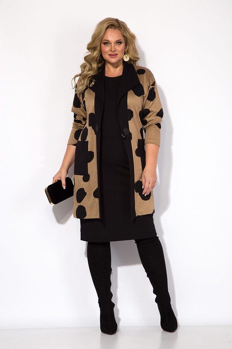 Эффектная двойка, состоящая из трикотажного платья-футляра и кардигана. Модель платья выполнена из качественного, теплого и уютного трикотажа на хлопковой основе. Платье полуприлегающего силуэта, длиной за колено. По низу предусмотрены небольшие разрезы на величину подгибки.  Плечо слегка спущено. Рукав укороченный, свободный.  В комплект входит удлиненный кардиган, полуприталенного силуэта с длинным вточным рукавом. Модель с оригинальным принтом.   Воротник - опаж, с застежкой встык на навесную декоративную пуговицу. По полочке предусмотрены накладные карманы. Спинка без особенностей, цельная.