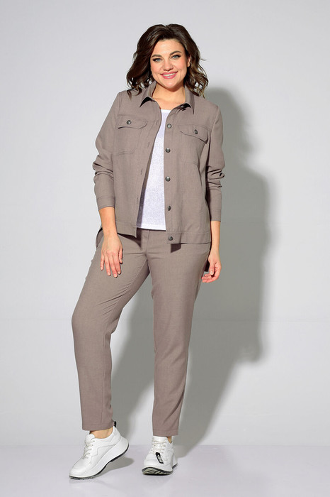 Жакет свободного кроя. Рукав втачной двух-шовный, низ рукава на притачной манжете с застёжкой на петлю и пуговицу. Воротник рубашечного типа на отрезной стойке. По переду накладные функциональные карманы с клапаном. По спинке отрезная кокетка. Спинка жакета длиннее чем перед. Брюки зауженные к низу. Верхний край брюк на притачном поясе, по спинке от боковых швов на резинке. Застежка брюк спереди по типу «гульфик». На задних половинках брюк накладные карманы, спереди карманы «хулиганы».