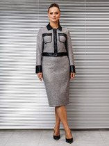 Жакет свободного кроя. Рукав втачной двух-шовный, низ рукава на притачной манжете с застёжкой на петлю и пуговицу. Воротник рубашечного типа на отрезной стойке. По переду накладные функциональные карманы с клапаном. По спинке отрезная кокетка. Спинка жакета длиннее чем перед. Брюки зауженные к низу. Верхний край брюк на притачном поясе, по спинке от боковых швов на резинке. Застежка брюк спереди по типу «гульфик». На задних половинках брюк накладные карманы, спереди карманы «хулиганы».