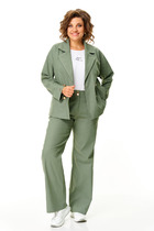 Жакет выполнен из костюмной ткани. Жакет Х-образного силуэта, длиной чуть ниже линии бёдер. Спереди центральная застежка на петли и пуговицы. По переду и спинке в области талии заложены складки. Спинка со средним швом. Воротник - цельнокроеная стойка. Рукав втачной двух шовный. Жакет на подкладке. Брюки прямого кроя. На передних половинках небольшая складка, переходящая в стрелку. Верхний срез брюк обработан притачным поясом, по бокам вставлена резинка, имеются шлёвки под ремень. Застёжка брюк по типу «гульфик». В боковых швах карманы «хулиганы». На задних половинках брюк вытачки.