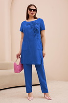 Минималистичный  дизайнерский комплект с вышивкой  выполнен из  натурального льна. Удлиненная  блузка   прямого  силуэта  с накладными карманами  и округлым вырезом украшена авторской вышивкой с цветочным мотивом. Перед оформлен отрезными бочками с нагрудными вытачками, спинка со средним швом. Застежка  на потайную молнию в среднем шве спинки.  Рукава втачные.  Прямые брюки средней посадки с отрезным поясом на резинке по спинке и бокам , по низу в боковых швах обработаны разрезы. Застежка обработана по классической   технологии  (гульфик с молнией и пуговица на поясе).