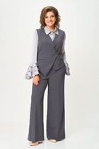 Жакет со стояче-отложным воротником и центральной застёжкой на петли и пуговицы. Изделие с отлетными деталями в верхней части переда и спинки. На уровне талии кулиса с завязкой по переду. Перед с накладными карманами с клапанами в нижней части. Рукава втачные с декоративными пуговицами. Жакет с дополнительным съёмным воротником на пуговицах.