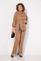 Комплект 2ка, состоящий из блузки и брюк. Изящная блуза из тонкой и нежной ткани с эффектом "свечения изнутри" и сатиновым блеском. Блуза свободного силуэта с V-образным вырезом. Это довольно глубокий вырез, который прекрасно подчёркивает декольте и линию шеи. Застежка на навесные петли и пуговицы. Рукава длинные объёмные втачные заканчиваются широкой манжетой с застёжкой на навесные петли с пуговицами. Брюки широкого объема, прямого силуэта. На передних половинках брюк заутюжены стрелки, переходящие в складки по линии талии. На задних половинках также заутюжены стрелки. В боковых швах расположены карманы. Застежка-гульфик. Пояс отрезной, притачной. В задней части пояса вставлена эластичная тесьма (резинка). На пояс настрочены шлевки. Выступающая часть пояса застегивается на петлю и крючок. Рост модели 170, размер 48.