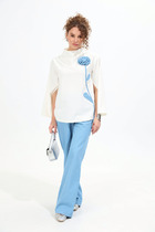 Костюм 2ка, состоящий из жилета и брюк. Удлиненный приталеный жилет с отложным вортником и лацканами. Застёжка центральная на пуговицу и петлю. По бокам выполнена имитация карманов с калапанами. Нижняя часть жилета состоит из двух слоёв: верхний -из лёгкой шифоновой ткани со стразами, нижний- из основной ткани . Длина по спинке 83-85 см. Брюки свободного прилегания по бедрам и зауженные к низу. Пояс на эластичной тесьме с кулисой и втянутым шнурком. Вход в карман фигурный, наклонный к боковому шву.
