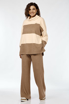 Комплект 2ка, состоящий из жилета и брюк. Жилет из трикотажного плотна без рукавов свободного силуэта прямого кроя с круглой горловиной.  Брюки широкого объема, прямого силуэта. На передних половинках брюк заутюжены стрелки, переходящие в складки по линии талии. На задних половинках также заутюжены стрелки. В боковых швах расположены карманы. Застежка-гульфик. Пояс отрезной, притачной. В задней части пояса вставлена эластичная тесьма (резинка). На пояс настрочены шлевки. Выступающая часть пояса застегивается на петлю и крючок.