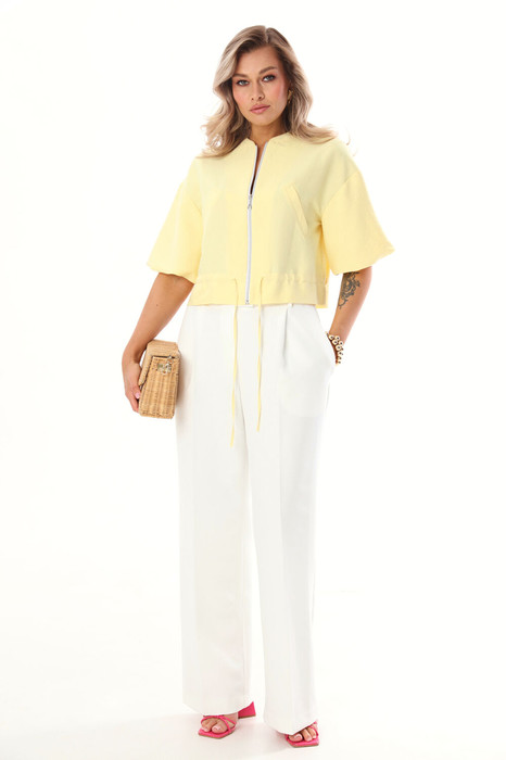 Комплект 2-ка, состоящий из укороченного бомбера и брюк. Бомбер с застёжкой на молнию и объёмными рукавами. Линия талии на кулисе и завязке из основной ткани.Брюки широкого объема, прямого силуэта. На передних половинках брюк заутюжены стрелки, переходящие в складки по линии талии. На задних половинках также заутюжены стрелки. В боковых швах расположены карманы. Застежка-гульфик. Пояс отрезной, притачной. В задней части пояса вставлена эластичная тесьма (резинка). На пояс настрочены шлевки. Выступающая часть пояса застегивается на петлю и крючок.