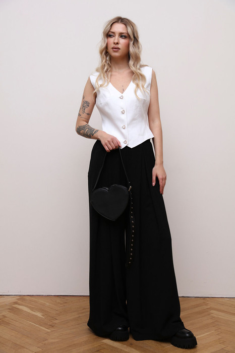Комплект 2ка, состоящий их жилета и брюк. Жилет прилегающего силуэта. На полочках нагрудные вытачки переведены в рельефы. На спинке плечевые вытачки и рельефы. В рельефах, на уровне талии два хлястика с застежкой на полукольца. По низу детали спинки фигурный вырез. Жилет на подкладке. Застежка центральная на четыре петли и пуговицы. Брюки широкого объема. По центру переда заложены две широкие встречные складки на каждой половинке. В боковых швах расположены карманы с наклонным входом. Талия на резинке.