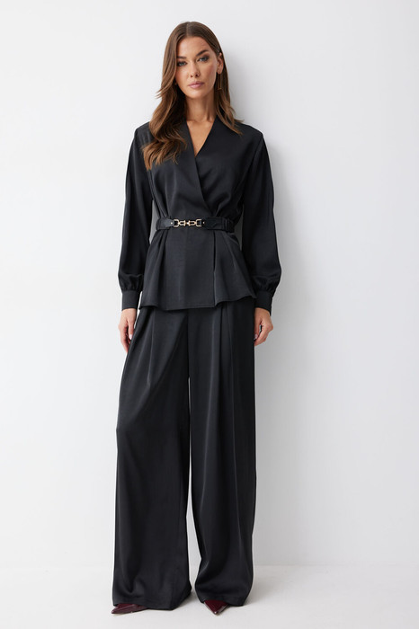 Брюки прямого силуэта расширенные книзу из струящейся ткани. По верху брюк притачной пояс с застежкой на петли и пуговицы. На передних половинках обработана застежка молния в среднем шве. На передних половинках карманы и декоративные складки. По поясу задних половинок брюк резинка и вытачки. Обращаем ваше внимание, что фурнитура может отличаться от фото.
