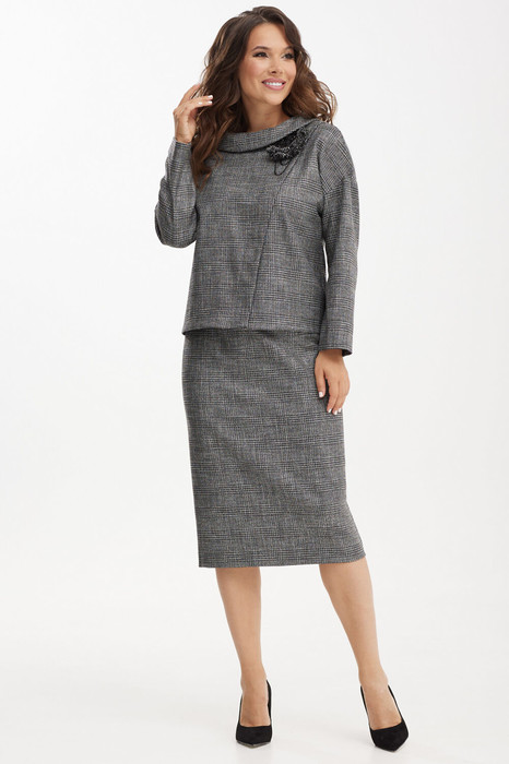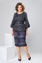 Элегантный комплект, состоящий из блузы и юбки, выполненных из мягкой костюмной ткани. Блуза полуприталенного силуэта со спущенным рукавом и отложным воротником. По спинке в средний шов вставлена молния. Юбка классического кроя, заднее полотнище со средним швом, застегивается на потайную молнию. Шов переходит к низу в шлицу. Длина блузы от плечевого шва 56 см. Длина рукава 51 см. Длина юбки 47 см