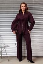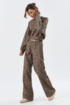 Стильный трикотажный костюм из джемпера и юбки. Джемпер свободного кроя со спущенным рукавом, дополненным притачной манжетой с застежкой на пришивную пуговицу. Горловина округлой формы, обработана довязом. Перед джемпера выполнен из мягкого трикотажного полотна с леопардовым принтом. Спинка и рукава выполнены из фактурного трикотажного полотна (рубчик). Юбка миди прямого кроя, на подкладке, с притачным поясом, дополненным эластичной тесьмой. Выполнена из фактурного трикотажного полотна (рубчик) Юбка дополнена боковым разрезом. Длина джемпера от плечевого шва 60см. Длина рукава 60см. Длина юбки 83см.