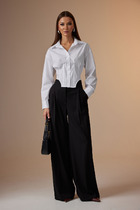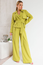 Стильный комплект из трикотажного джемпера и брюк прямого кроя. Джемпер свободного прямого кроя с длинным спущенным рукавом. Горловина округлой формы. Джемпер выполнен из трикотажного полотна средней плотности. Дополнен джемпер съемной брошью (в комплекте).