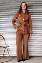 Элегантный  комплект из жакета и юбки. Однобортный жакет полуприлегающего силуэта , на хлопковой подкладке, с центральной застежкой на потайные кнопки. Рукав втачной. Жакет дополнен декоративным элементом в виде пояса с застежкой по боку на пуговицу, а так же функциональными карманами с клапанами. Выполнен жакет из поливискозного полотна цвета лайм в меловую полоску. Юбка прямого кроя, на хлопковой подкладке, с притачным поясом, дополненным эластичной тесьмой.  Застежка по спинке на потайную молнию и пуговицу. Юбка выполнена из  натуральной вискозной ткани с вкраплениями из органзы. По спинке в среднем шве расположен разрез. Длина жакета от плечевого шва 65см.  Длина рукава 30см. Длина юбки 75см.