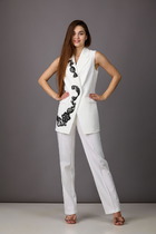 Стильный комплект из джемпера и брюк. Джемпер свободного кроя. Перед выполнен из гладкого трикотажного полотна в полоску. Спинка выполнена из плотной рубашечной ткани. Рукав втачной, слегка спущен. Дополнен притачными манжетами. Горловина округлой формы. По спинке джемпер длиннее. Удобные и очень практичные брюки свободного кроя, слегка заужены к низу, с притачным поясом, дополненным эластичной тесьмой и шлевками для пояса. Посадка средняя. Застежка гульфик на молнию и пуговицу. Выполнены из плотного трикотажного полотна. Брюки дополнены удобными боковыми и накладными задними карманми. Длина джемпера от плечевого шва по переду 65см, по спинке 72см. Длина рукава 60см. Длина брюк по боковому шву 98см.