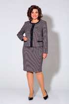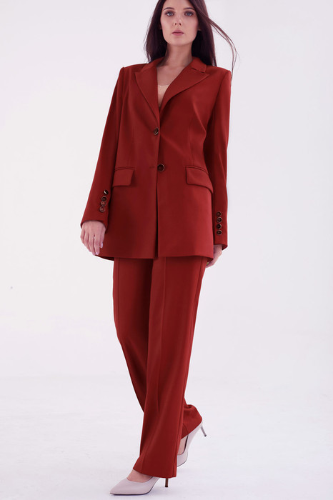 Костюм  женский.  Жакет классический на подкладке . По переду - вытачки,переведенные в карман. Карман в рамку, с клапаном. Спинка - со средним швом. Воротник пиджачного типа с отворотом лацкана, застежка однобортная на 2 пуговицы. Рукав втачной, длинный, по переднему шву  - со шлицей на 4 петли и пуговицы.  Брюки прямые  по переду  со стрелками. Верхний срез оббработан  обтачкой. Потайная молния  в боковом  шве.