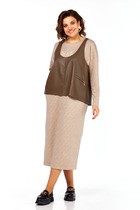 Костюм женский из трикотажного гладкокрашенного меланжированого полотна «кулирка», состоящий из футболки и брюк.Футболка - классического покроя, с короткими втачными рукавами, горловиной V- образной формы и принтом на полочке, выполненным в технике «шелкографии». Горловина обработана втачной планкой из основного материала.Брюки - свободного покроя, с карманами в боковых швах, на притачном поясе с эластичной тесьмой внутри.